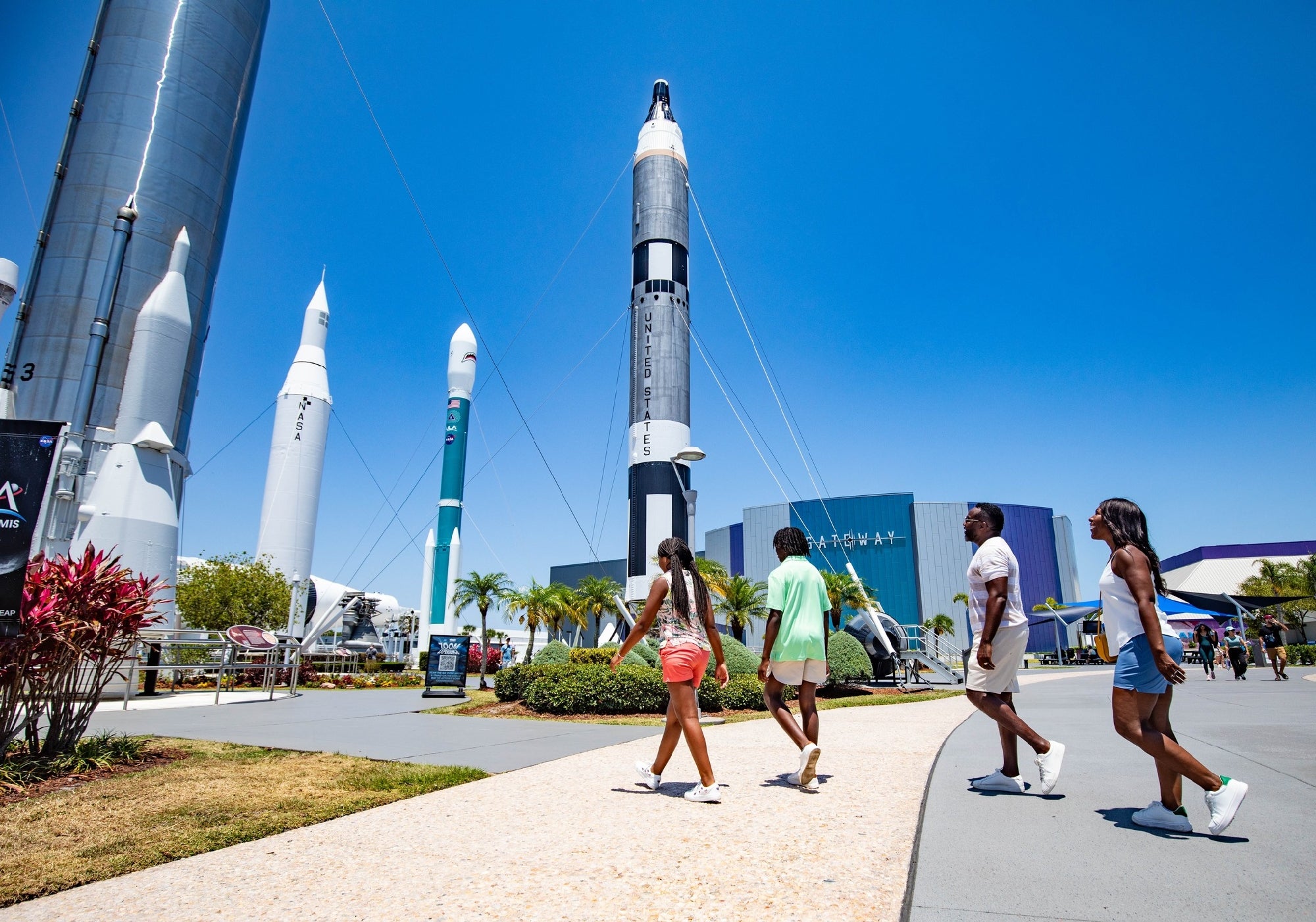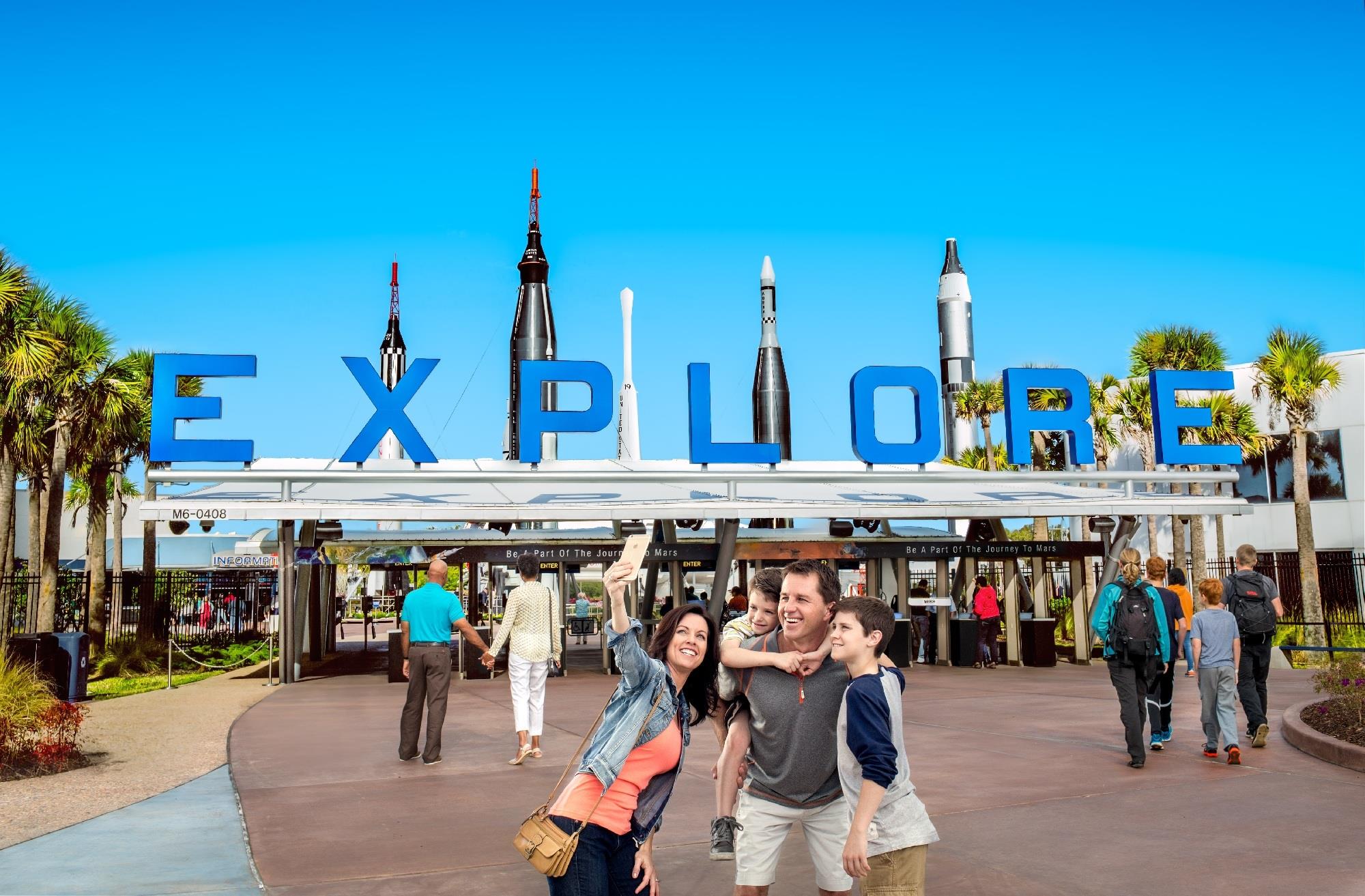 Kennedy Space Center Visitor Complex features the Space Shuttle Atlantis exhibit, Apollo/Saturn V Center, IMAX space films, Rocket Garden guided tour, astronaut meet-and-greets, HYPERDECK virtual reality experience, and more.